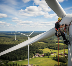 vindkraftstekniker i säkerhetsutrustning som arbetar på toppen av en vindturbin i Sverige. I bakgrunden syns ett vidsträckt landskap med skog och fält, och fler vindkraftverk syns i fjärran